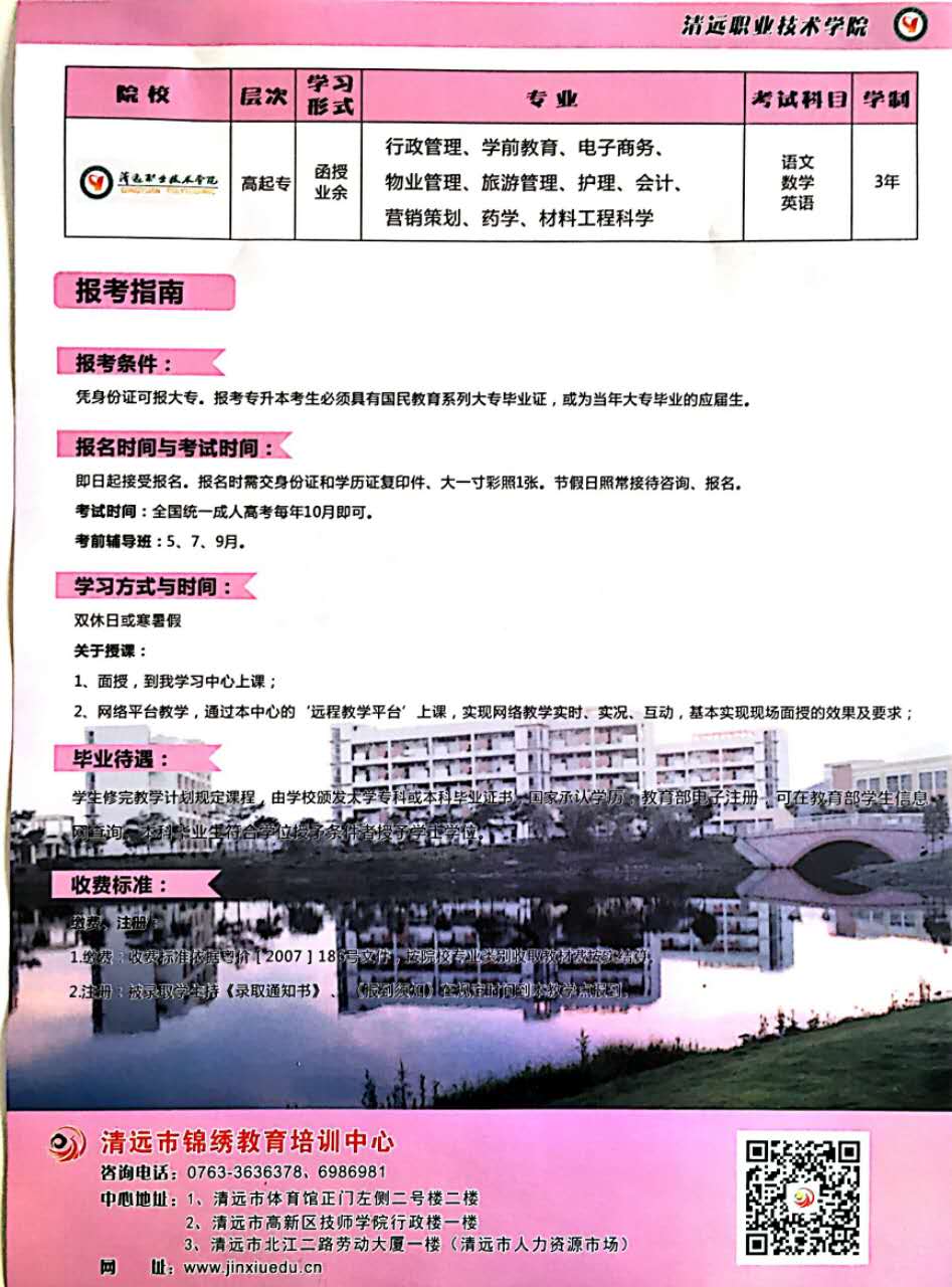 北京大學(xué)、清遠(yuǎn)職業(yè)技術(shù)學(xué)院圓夢計(jì)劃正式啟動,三年學(xué)費(fèi)只需5000元,考試前一百名三年學(xué)費(fèi)只需1000元,心動不如行動,趕快加入圓夢計(jì)劃吧!咨詢熱線:0763-3630112 報名地址:清遠(yuǎn)市北江二路勞動大廈一樓