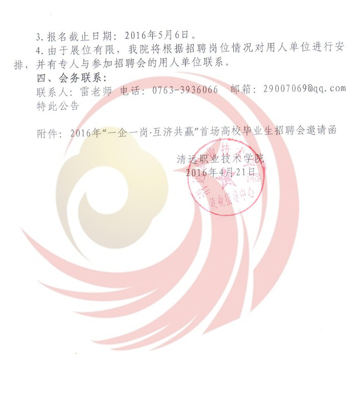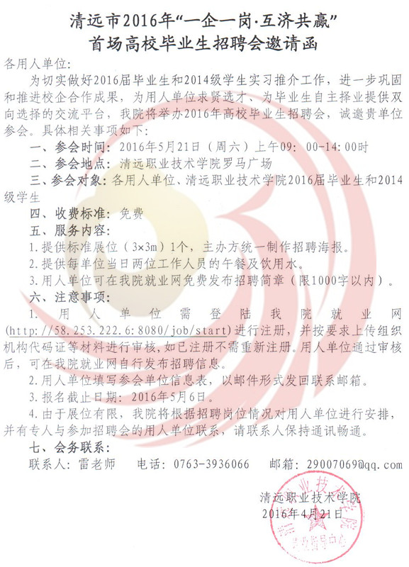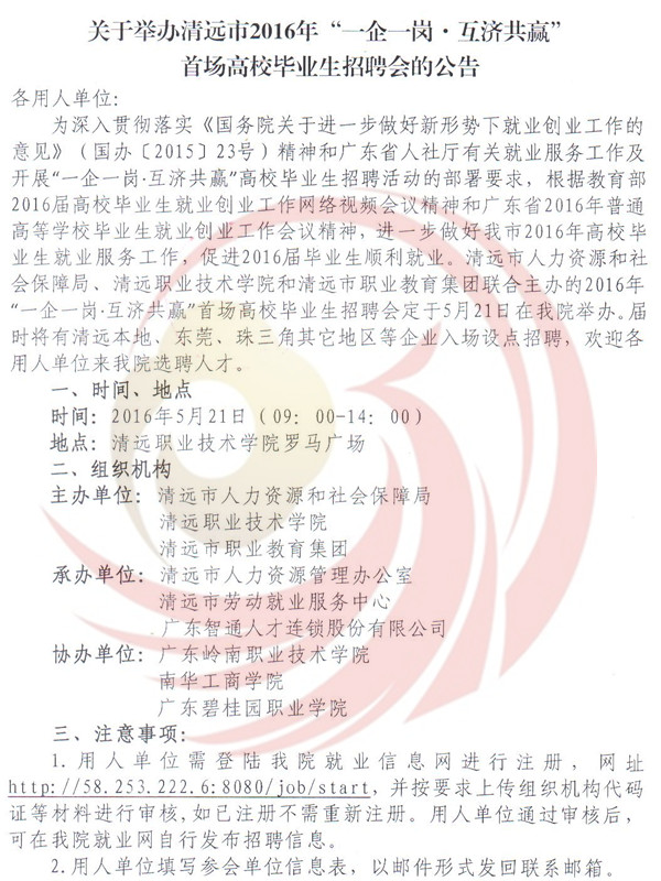 為深入貫徹落實(shí)《國務(wù)院關(guān)于進(jìn)一步做好新形勢下就業(yè)創(chuàng)業(yè)工作的意見》(國辦﹝2015﹞23號(hào))精神和廣東省人社廳有關(guān)就業(yè)服務(wù)工作及開展“一企一崗▪互濟(jì)共贏”高校畢業(yè)生找屁活動(dòng)的部署要求,根據(jù)教育部2016屆高校畢業(yè)生就業(yè)創(chuàng)業(yè)工作網(wǎng)絡(luò)視頻會(huì)議精神和廣東省2016年普通高等學(xué)校畢業(yè)生就業(yè)創(chuàng)業(yè)工作會(huì)議精神,進(jìn)一步做好我市2016年高校畢業(yè)生就業(yè)服務(wù)工作,促進(jìn)2016屆畢業(yè)生順利就業(yè)。清遠(yuǎn)市人力資源四川和社會(huì)保障局,清遠(yuǎn)市職業(yè)技術(shù)學(xué)院和清遠(yuǎn)市職業(yè)教育集團(tuán)聯(lián)合主辦的2016年“一企一崗▪互濟(jì)共贏”首場高校畢業(yè)生招聘會(huì)定于5月21日在清遠(yuǎn)市職業(yè)技術(shù)學(xué)院舉辦,屆時(shí)將有清遠(yuǎn)本地、東莞、珠三角其他地區(qū)等企業(yè)入場設(shè)點(diǎn)招聘,歡迎各用人單位到清遠(yuǎn)市職業(yè)技術(shù)學(xué)院選聘人才。